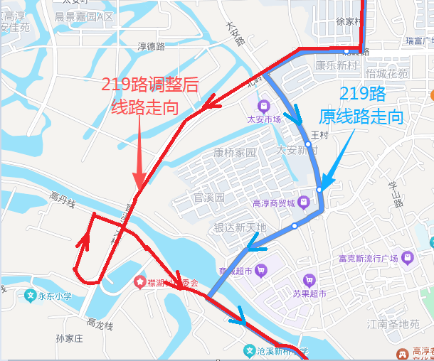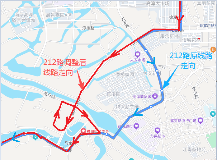 調整后運行線路走向:運行線路:高淳樞紐站—華地嘉園—紅太陽廣場—鳳嶺公園—甘霖路口—淳中路口(轉至太安路)—康橋家園—王村—官溪河大橋—觀音閣—紅廟閘—原線路不變(沿薛盛線轉雙磚線)—水碧橋,不再停靠:天河市場等站點,新增:康橋家園、王村、襟湖橋等站點。