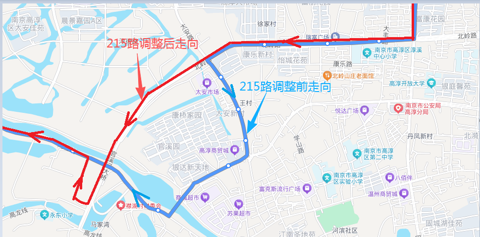調整后運行線路走向:高淳樞紐站—汽車城—景和名苑—璟熙府南—官溪河大橋(太安路和北嶺路十字路口轉)—觀音閣—紅廟閘—原線路不變(沿獅樹行駛后轉大涵線、大新線)—相國圩(官場),不再停靠:王村、康橋家園、天河市場等站點。