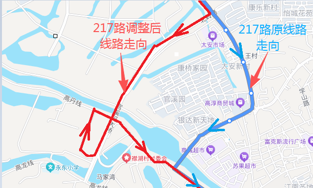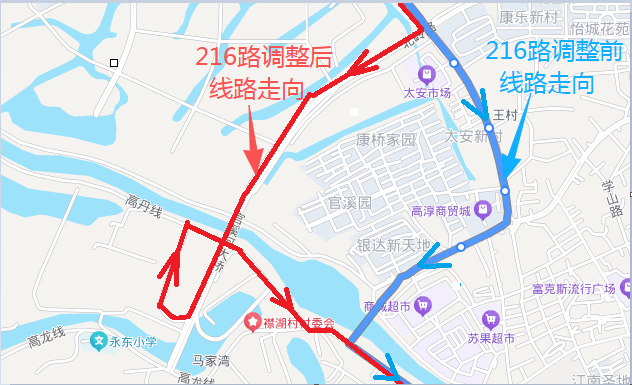 調整后運行線路走向:淳中路口—康橋家園—王村—官溪河大橋—上頭埂—河口灣—原線路不變(高丹線)—三壩,不再停靠:襟湖橋等站點,新增:淳中路口、康橋家園、王村等站點。