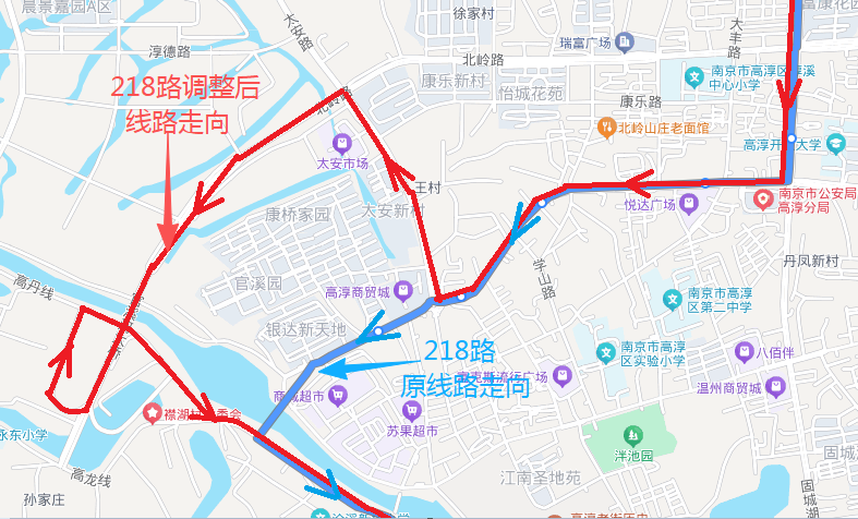 調整后運行線路走向:高淳樞紐站—汽車城—景和名苑—璟熙府南—官溪河大橋(太安路和北嶺路十字路口轉)—觀音閣—紅廟閘—原線路不變(獅樹線)—正覺寺南,不再停靠:王村、康橋家園、天河市場等站點。